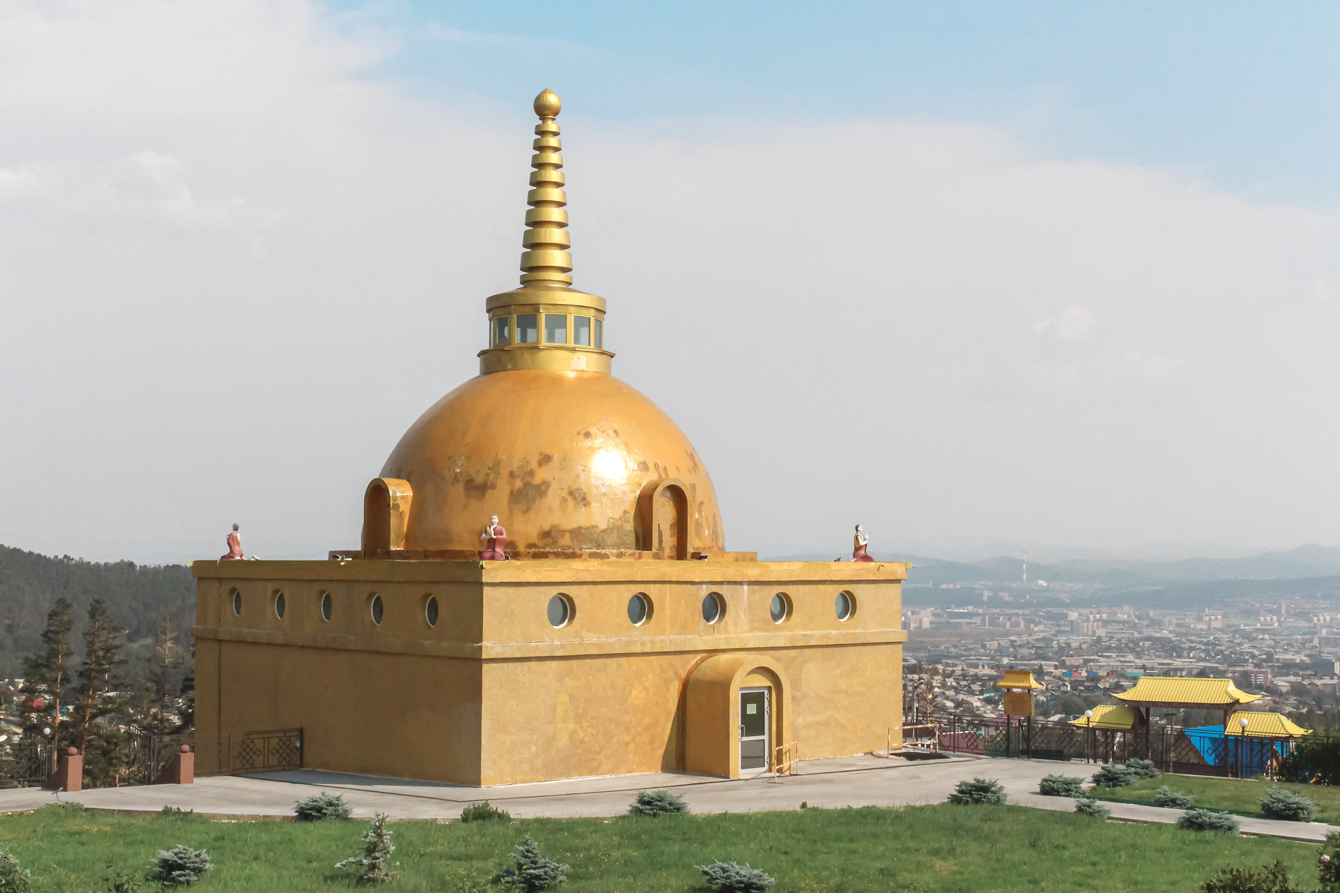 A golden stupa of Rinpoche Bagsha Datsan overlooking the capital city of the Republic of Buryatia, Ulan-Ude, Russia (2018)